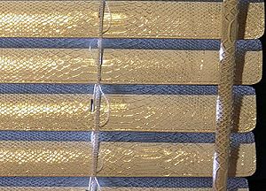 These stunning leather blinds in genuine cow hide come in many colours and are made to measure by master craftsmen. Available as Mono manual control or can be electrified. 50mm slats only.